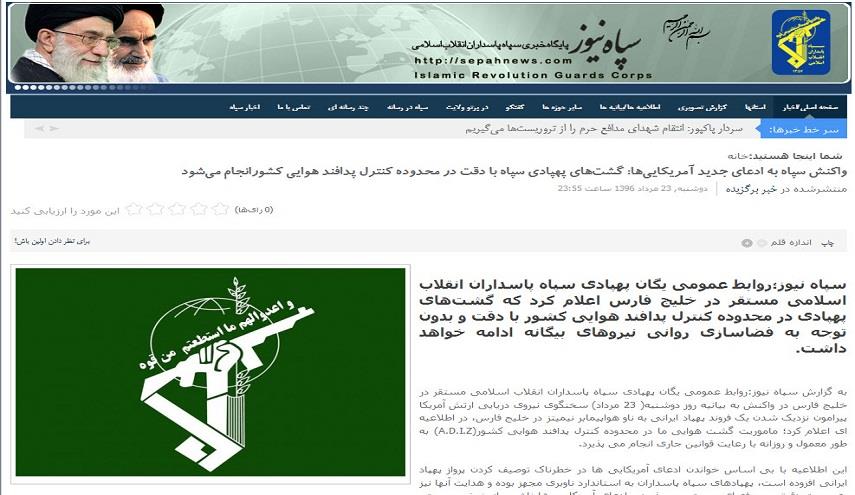 اعلن حرس الثورة الاسلامية بان طائراته المسیرة تقوم بعملیات الدوریة في نطاق سیطرة الدفاع الجوی للبلاد بدقة ودون الاكتراث باجواء الحرب النفسیة المثارة من قبل القوات الاجنبیة.