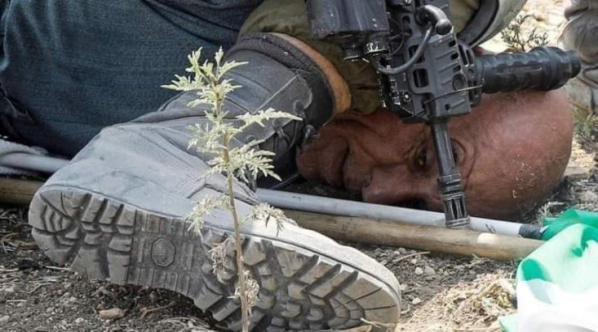جندي صهيوني يدعس بركبته على مسن فلسطيني بطريقة جورج فلويد
