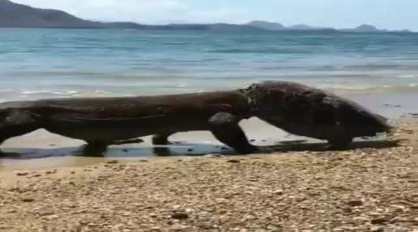 منوعات - الكوثر: تداول رواد مواقع التواصل الاجتماعي، مقطع فيديو وثقه أحد الأشخاص كان يستجم على الشاطئ، لتنين كومودو يخرج من البحر ممسكا بفريسة بين فكيه.
