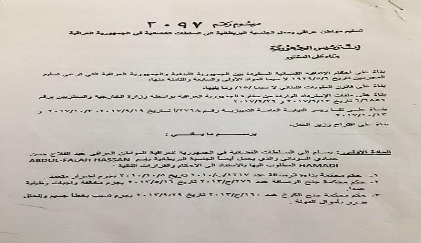 بالوثيقة.. مرسوم لبناني يقضي بتسليم عبد الفلاح السوداني للسلطات العراقية