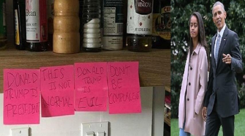 الأميرکيتان _الكوثر:وصفت ماليا ابنة الرئيس الأمريكي السابق باراك أوباما، البالغة 20 عاما الرئيس الحالي دونالد ترامب بـ"الشرير"، ودوّنت تقييمها هذا في صفحة سرية لها على فيسبوك.