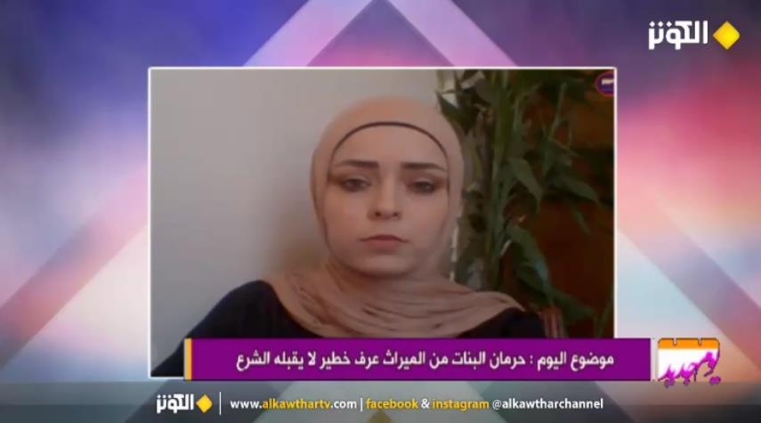 خاص الكوثر: برنامج يوم جديد يتناول بالدراسة أهم الأحداث الاجتماعية والفكرية والثقافية، حيث تطرق البرنامج في هذه الحلقة الى موضوع : " حرمان البنات من الميراث عرف خطير لايقبله الشرع " في حوار مع الاستاذة " سماح الكحلة "باحثة دولية في الشؤون المجتمعية من رام الله.