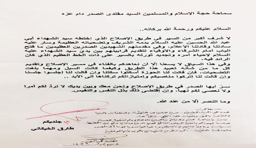 رد زعيم التيار الصدري على رسالة وجهها له الوزير السابق المنتمي لتياره المدعو طارق الخيكاني