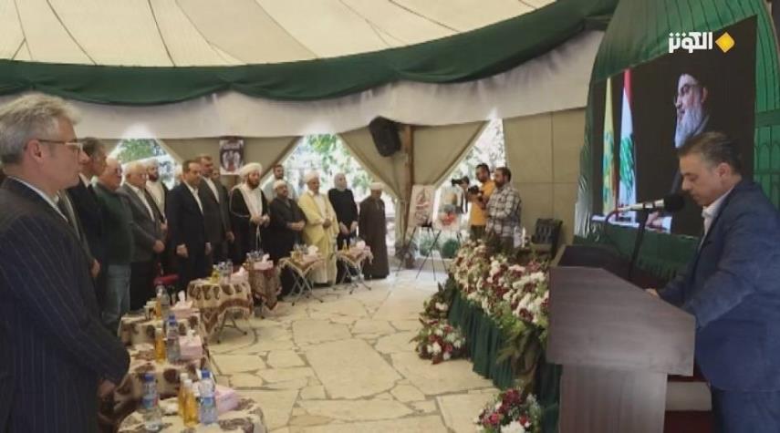 تلي في القنصلية الايرانية بحلب على مسامع الحاضرين بيان النعي، بيان اعلان التحاق سيد الامة الامين العام لحزب الله السيد حسن نصرالله بشهداء طريق القدس.