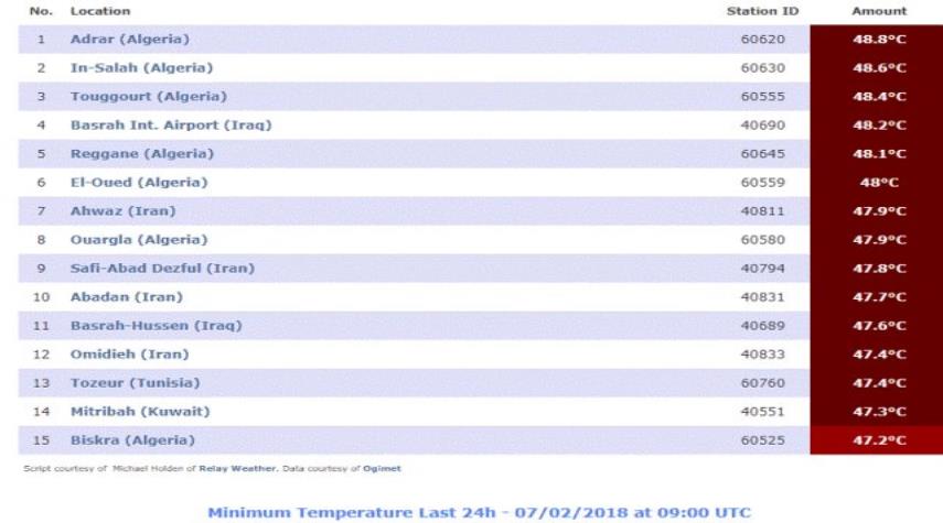 منوعات _ الكوثر: نشرت محطة "بلاسيرفيلي" في كاليفورنيا الأمريكية، جدولا يضم 15 منطقة ودولة بأعلى درجات الحرارة في العالم خلال الـ24 ساعة الماضية.