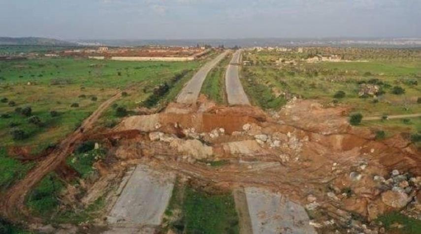 سوريا-الكوثر: عمدت جماعات إرهابية تدعمها تركيا في ادلب شمال غرب سوريا إلى تخريب طريق حلب – اللاذقية M4 عبر حفره بالجرافات وانشاء ساتر ترابي لمنع تسير الدوريات التركية – الروسية المشتركة.