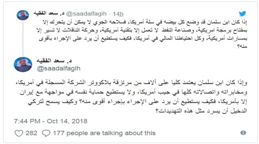 الكوثر _ السعودية: قال المعارض السعودي المعروف، الدكتور سعد الفقيه، في سلسلة من التغريدات على “تويتر” إن التهديدات السعودية برد قوي على أي عقوبات أمريكية محتملة هي “مجرد هراء”.