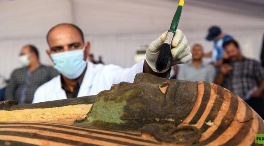 مصر_الکوثر: فتح خالد العناني وزير السياحة والآثار المصري إحدى التوابيت الفرعونية التي تم اكتشافها في منطقة سقارة الأثرية أمام جمع من السفراء والإعلاميين.