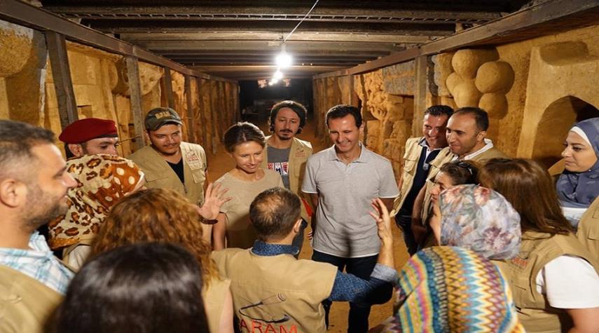 شاهد..الأسد وعقيلته داخل أحد أنفاق الموت بحي جوبر!