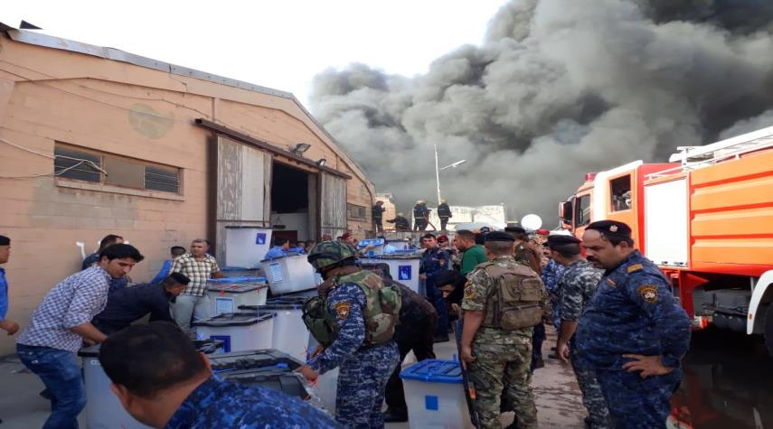 العراق - الكوثر: قام فرق الدفاع المدني العراقي بإخراج صناديق التصويت في الانتخابات الأخيرة بالعراق، وسط تصاعد أعمدة الدخان الأسود من مكان الحريق.