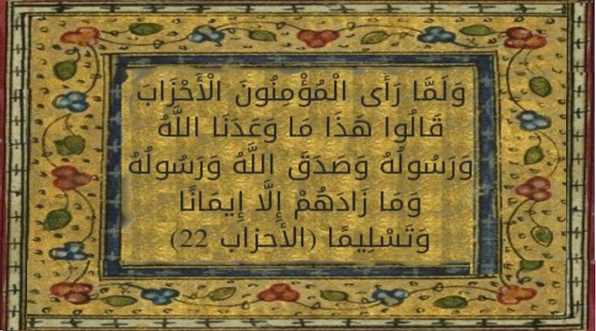القرآن الكريم-الكوثر: يقول الله تعالى في محكم كتابه الكريم: {وَلَمَّا رَأَى الْمُؤْمِنُونَ الْأَحْزَابَ قَالُوا هَذَا مَا وَعَدَنَا اللَّهُ وَرَسُولُهُ وَصَدَقَ اللَّهُ وَرَسُولُهُ وَمَا زَادَهُمْ إِلَّا إِيمَانًا وَتَسْلِيمًا}، سورةالأحزاب المباركة: (آية: 22).