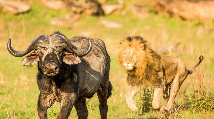 شاهد بالفيديو.... بوفالو يقضي على أسد بعد خطأ فجيع !