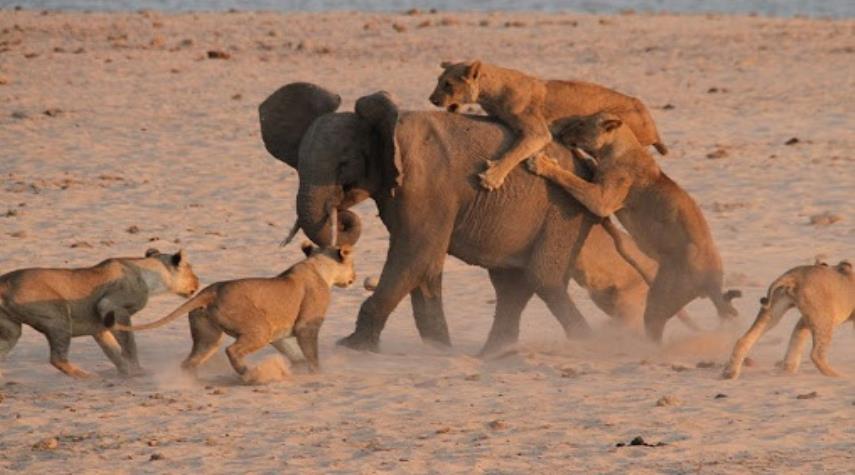 شاهد بالفيديو .. صغير الفيل يهزم 11 أسدا