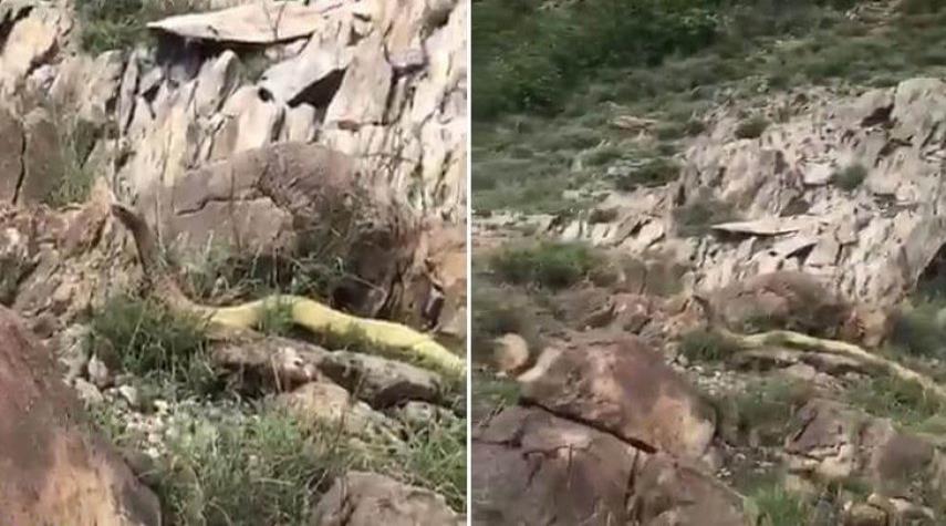 شاهد بالفيديو...العثور على ثعبان ضخم غريب الشكل في منطقة جبلية