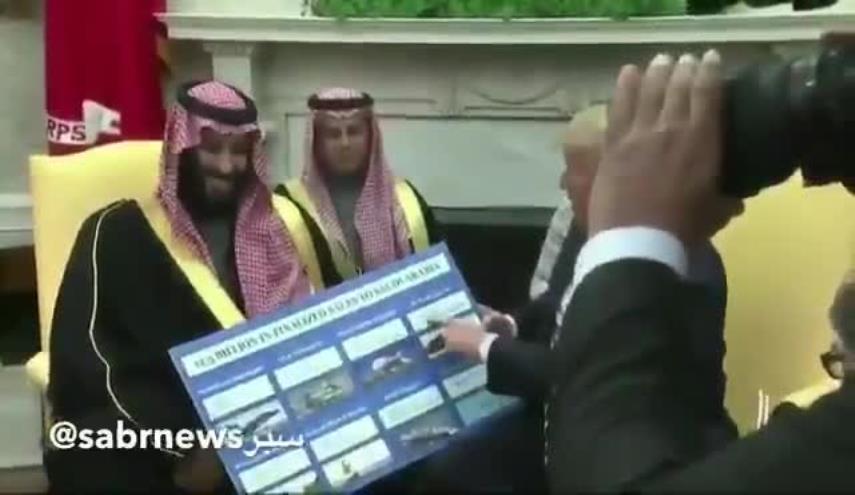 السعودية _ الكوثر: في مشهدٍ مُهين وفيه من الذلّ ما فيه، عرضَ الرئيس الأمريكي دونالد ترامب، خلال لقائه بولي العهد السعودي محمد بن سلمان، في واشنطن، الثلاثاء، لوحة عليها المبالغ التي سوف تدفعها السعودية لأمريكا، مقابل صفقات الأسلحة التي أبرمت بين الطرفين.