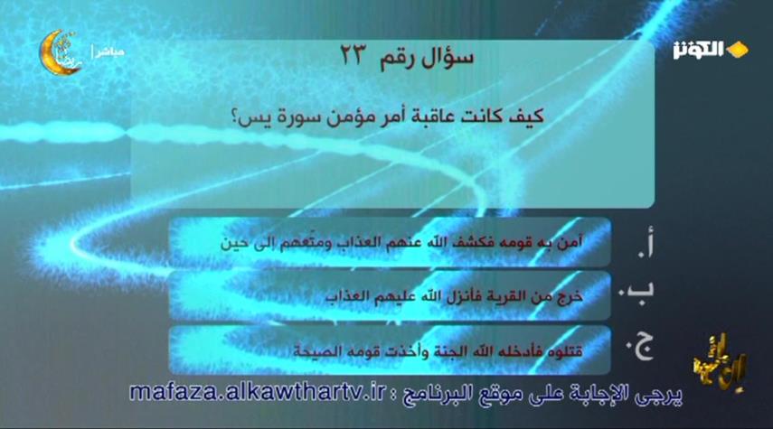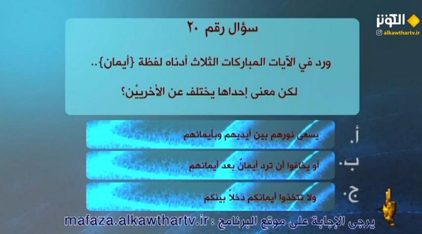 المسابقة القرآنية العشرون من سلسلة الاسئلة القرآنية الخاصة بالمشاهدين ضمن المسابقة القرآنية ان للمتقين مفازا لعام 2023 ممن عمره 12 سنة فما فوق.