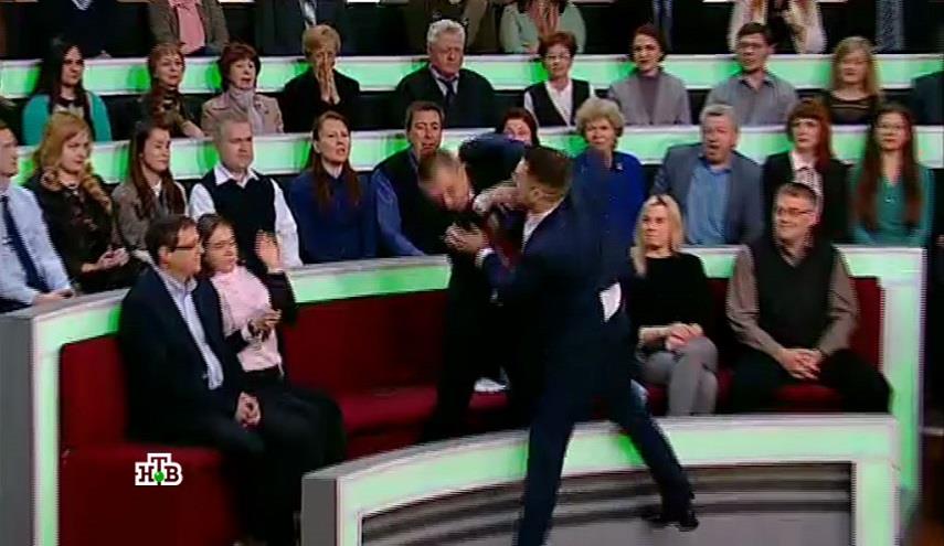 منوعات_الكوثر: في مشهد صادم تداول ناشطون بمواقع التواصل مقطعا مصورا، أظهر اشتباكا عنيفا تخلله (سباب ولكمات) بين مذيع روسي وأحد ضيوفه ما أثار فزع الحاضرين بالاستوديو، وتدخلات كثيرة لفض الاشتباك بينهما.