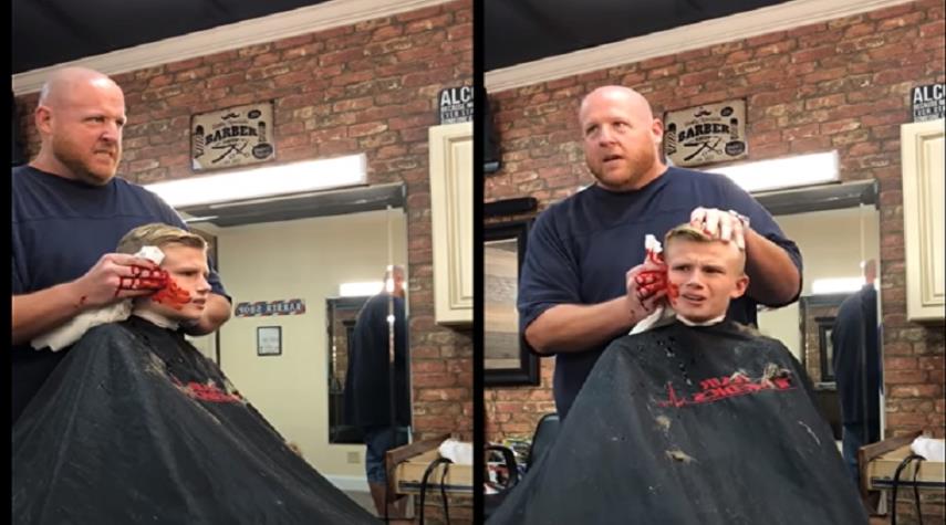 شاهدبالفيديو... ردة فعل طفل بعد تظاهر الحلاق بقطع أذنه