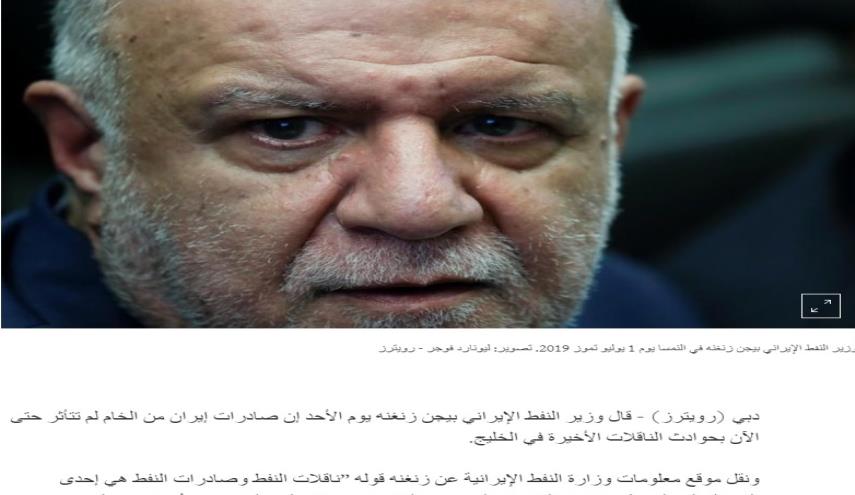 قضية ساخنة_الكوثر: قال وزير النفط الإيراني بيجن زنغنه إن صادرات إيران من الخام لم تتأثر حتى الآن بحوادث الناقلات الأخيرة في الخليج الفارسي.