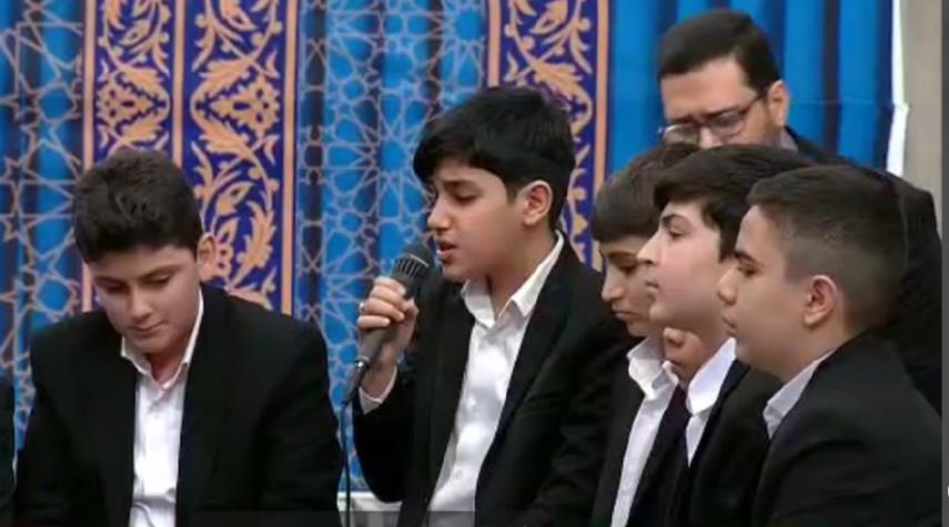 فتية ينشدون في محضر قائد الثورة الاسلامية في ايران الإمام الخامنئي بمناسبة ذكرى ولادة سبط رسول الله أبا عبدالله الحسين عليه السلام .