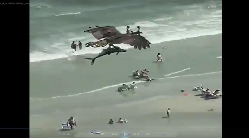 منوعات-الكوثر: تداول رواد مواقع التواصل الإجتماعي مقطع فيديو مدهش يظهر نسر ضخم اصطاد سمكة قرش ويطير بها في السماء.