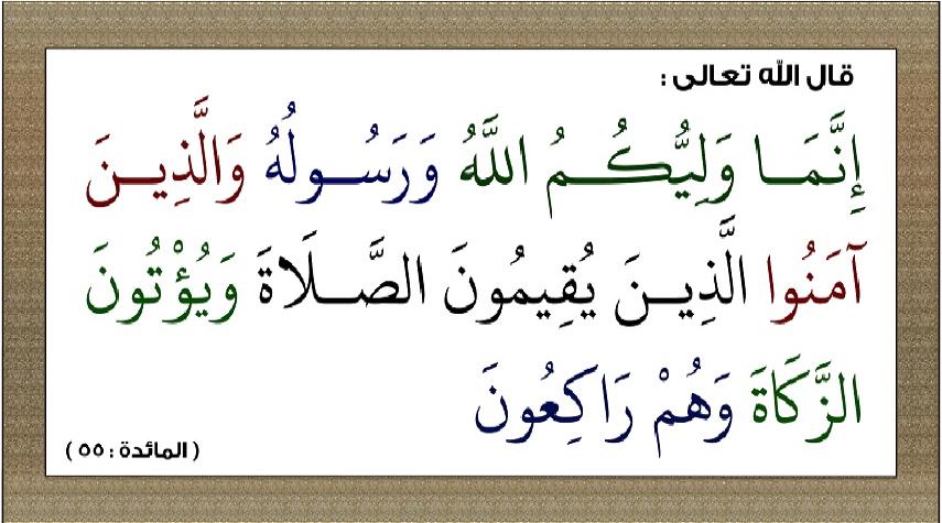 القرآن الكريم-الكوثر: (إِنَّمَا وَلِيُّكُمُ اللَّهُ وَرَسُولُهُ وَالَّذِينَ آمَنُوا الَّذِينَ يُقِيمُونَ الصَّلاةَ وَيُؤْتُونَ الزَّكَاةَ وَهُمْ رَاكِعُونَ)، سورة المائدة المباركة، آية:55.