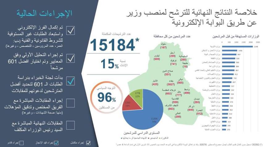 العراق-الكوثر: أعلن مكتب رئيس الوزراء المكلف عادل عبد المهدي، يوم الجمعة 13تشرين الأول/أكتوبر، عن إغلاق باب الترشح لمنصب وزير الكترونيا، مبينا عدد الترشيحات المكتملة.