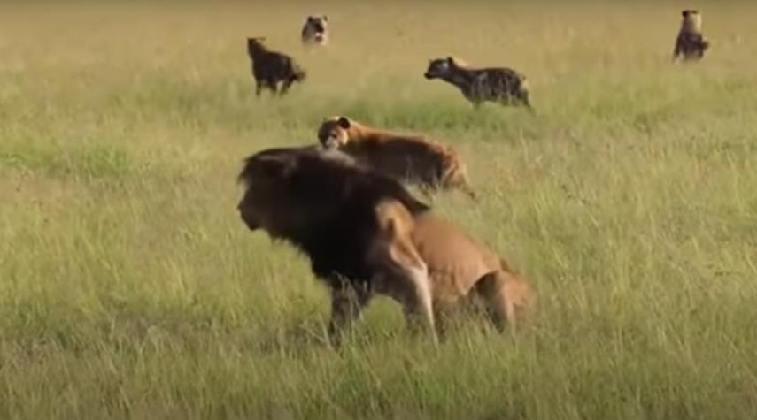 بالفيديو... أسد يطرد قطيعا من الضباع الجائعة بحركة واحدة