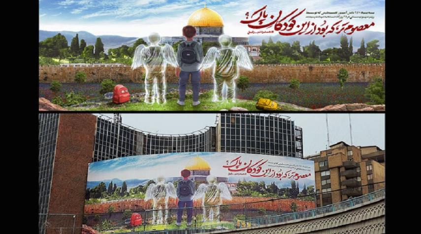 تضامناً مع اطفال غزة الشهداء... تغيير اللوحة الجدارية في ساحة ولي العصر "عج"