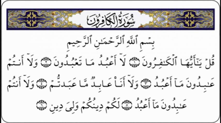 الكوثر: قال تعالى : {قُلْ يَا أَيُّهَا الْكَافِرُونَ (1) لَا أَعْبُدُ مَا تَعْبُدُونَ (2) وَلَا أَنْتُمْ عَابِدُونَ مَا أَعْبُدُ (3) وَلَا أَنَا عَابِدٌ مَا عَبَدْتُمْ (4) وَلَا أَنْتُمْ عَابِدُونَ مَا أَعْبُدُ(5) لَكُمْ دِينُكُمْ وَلِيَ دِينِ} [الكافرون : 1 - 6].
