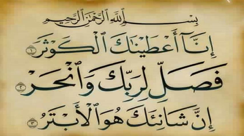 الكوثر: قال تعالى : {إِنَّا أَعْطَيْنَاكَ الْكَوْثَرَ (1) فَصَلِّ لِرَبِّكَ وَانْحَرْ (2) إِنَّ شَانِئَكَ هُوَ الْأَبْتَرُ } [الكوثر : 1 - 3] .
