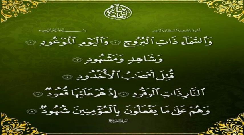 الكوثر: قال تعالى : {وَالسَّمَاءِ ذَاتِ الْبُرُوجِ (1) وَالْيَوْمِ الْمَوْعُودِ (2) وَشَاهِدٍ وَمَشْهُودٍ (3) قُتِلَ أَصْحَابُ الْأُخْدُودِ (4) النَّارِ ذَاتِ الْوَقُودِ..} [البروج : 1 - 5] .