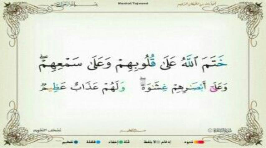 الكوثر: قال تعالى : {خَتَمَ اللَّهُ عَلَى قُلُوبِهِمْ وَعَلَى سَمْعِهِمْ وَعَلَى أَبْصَارِهِمْ غِشَاوَةٌ وَلَهُمْ عَذَابٌ عَظِيمٌ } [البقرة : 7]