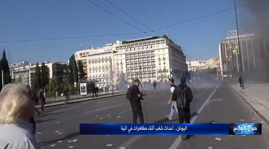 شهدت العاصمة اليونانية أثينا اعمال شغب واضطرابات عقب احتجاجات في إطار إضراب نقابي شامل بالبلاد، أمام النصب التذكاري للجندي المجهول قرب مقر البرلمان اليوناني في أثينا.