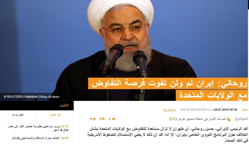 ايران _ الكوثر: نقل موقع سبوتنيك تأكيد الرئيس الإيراني، حسن روحاني على أن طهران لا تزال مستعدة للتفاوض مع الولايات المتحدة بشأن الخلاف حول البرنامج النووي الخاص بإيران، إلا أنه أكد أن ذلك لا يعني الاستسلام للضغوط الأمريكية في ذلك الصدد.