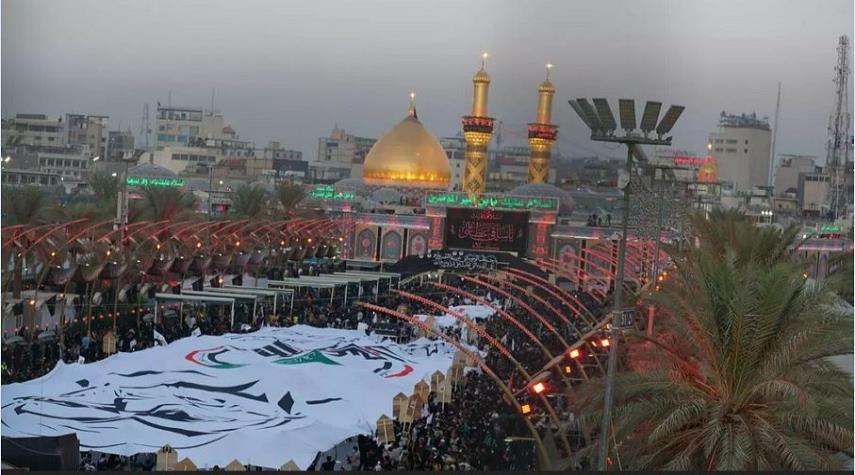 الاربعين-الكوثر: رفعت جماهير الحشد الشعبي اكبر راية للحشد وصورة للقائد الشهيد ابو مهدي المهندس بين الحرمين الشريفين في كربلاء المقدسة.