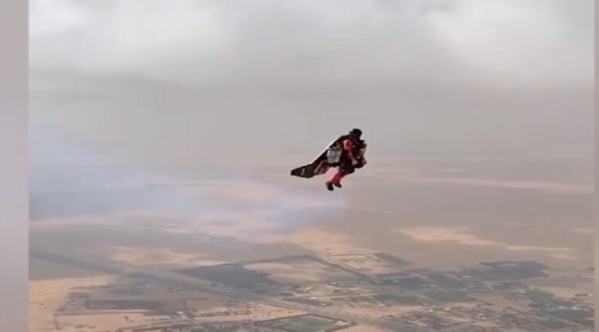 شاهدبالفيديو...ولي عهد دبي يحلق بزي حديدي في السماء