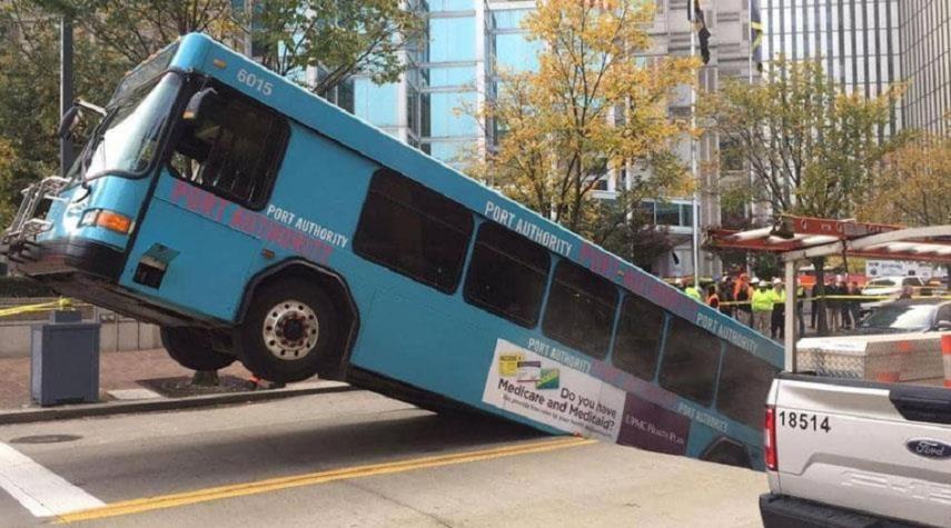 شاهد..حفرة "مفاجئة" تبتلع حافلة أثناء سيرها