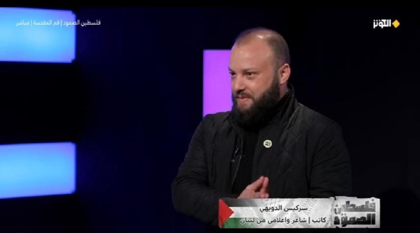 وجه الإعلامي الأستاذ سركيس الدويهي خلال مشاركته في برنامج فلسطين الصمود رسالة خاصة الى سماحة السيد حسن نصر الله.