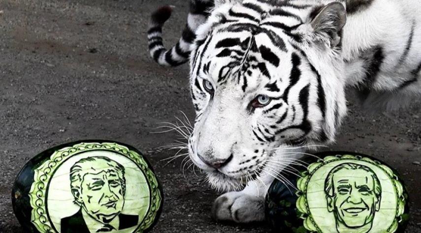 منوعات_الكوثر: وضعت حديقة حيوانات في روسيا ثمار بطيخ نحتت عليها صور للمتنافسين على كرسي الرئاسة بالولايات المتحدة، دونالد ترامب وجو بايدن.