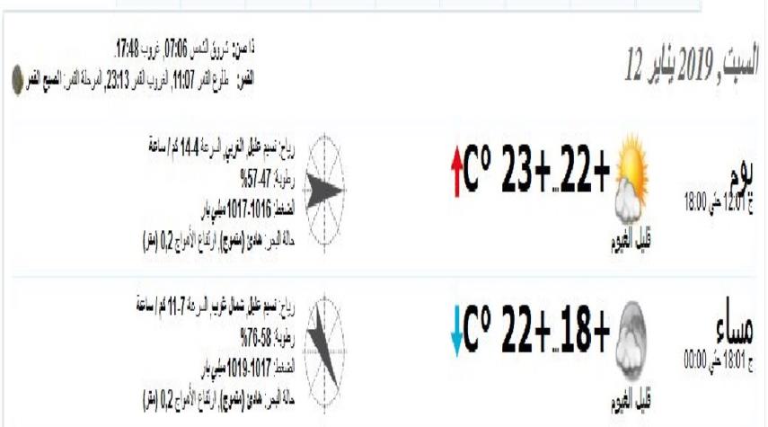 الامارات - الكوثر: سيكون الطقس في امارة الشارقة اليوم السبت وخلال استضافة مباراة العراق واليمن على النحو التالي :