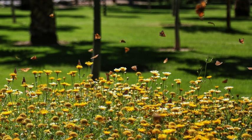 منوعات - أدى هطول الأمطار بنسب معينة في مدينة قم المقدسة الايرانية في فصل الربيع إلى زيادة الغطاء النباتي في مختلف مناطق المحافظة ما استقطب عدد كبير من الفراشات المهاجرة.