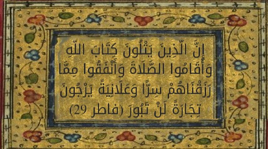 القرآن الكريم-الكوثر: قال الله تعالى في محكم كتابه المجيد (( إِنَّ ٱلَّذِينَ يَتْلُونَ كِتَٰبَ ٱللَّهِ وَأَقَامُواْ ٱلصَّلَوٰةَ وَأَنفَقُواْ مِمَّا رَزَقْنَٰهُمْ سِرًّا وَعَلَانِيَةً يَرْجُونَ تِجَٰارَةً لَّن تَبُورَ * لِيُوَفِّيَهُمْ أُجُورَهُمْ وَيَزِيدَهُم مِّن فَضْلِهِ ۚ إِنَّهُ غَفُورٌ شَكُورٌ)) (فاطر:29-30).