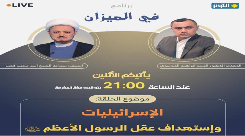 سيبحث برنامج في الميزان في حلقة هذا المساء موضوع " الاسرائيليات واستهداف عقل الرسول الأعظم صلى الله عليه وآله وسلم، مع الخبير الدائم للبرنامج الاستاذ الحوزوي سماحة الشيخ "اسد محمد قصير".