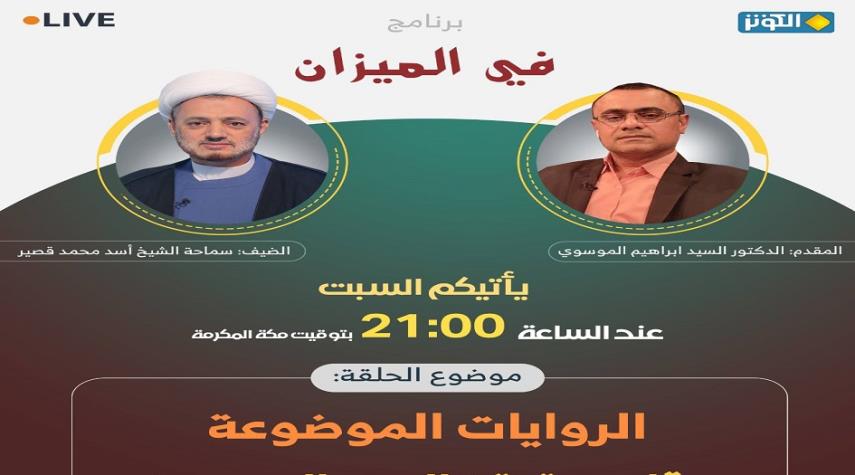 سيفند برنامج في الميزان في حلقة هذا المساء "الروايات الموضوعة التي تحاول قلب حقيقة الصور المحمدية، مع الخبير الدائم للبرنامج الاستاذ الحوزوي "سماحة الشيخ اسد محمد قصير".