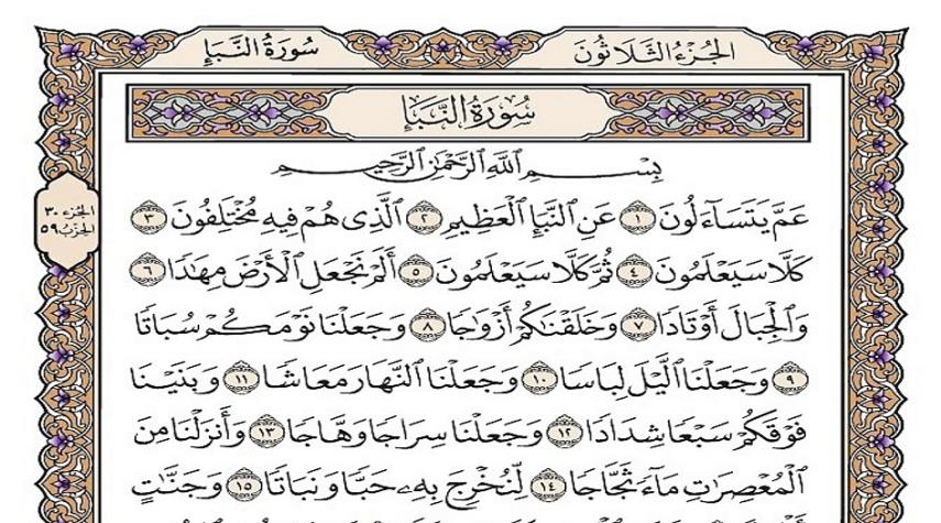 القرآن الكريم-الكوثر: سورة النبأ مكية وعدد آياتها 40 آية، قال تبارك وتعالى في محكم كتابه العزيز (بِسْمِ اللَّهِ الرَّحْمَنِ الرَّحِيمِ: عَمَّ يَتَسَاءَلُونَ (1) عَنِ النَّبَإِ الْعَظِيمِ (2) الَّذِي هُمْ فِيهِ مُخْتَلِفُونَ (3) كَلَّا سَيَعْلَمُونَ (4) ....