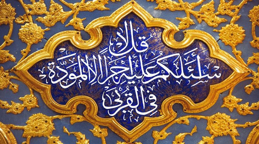 القرآن الكريم-الكوثر: قال الله تعالى في محكم كتابه المجيد: {قُل لاَّ أَسْئَلُكُمْ عَلَيْهِ أَجْراً إِلاَّ الْمَوَدَّةَ فِى الْقُرْبَى{.. سورة الشورى، الآية 23.