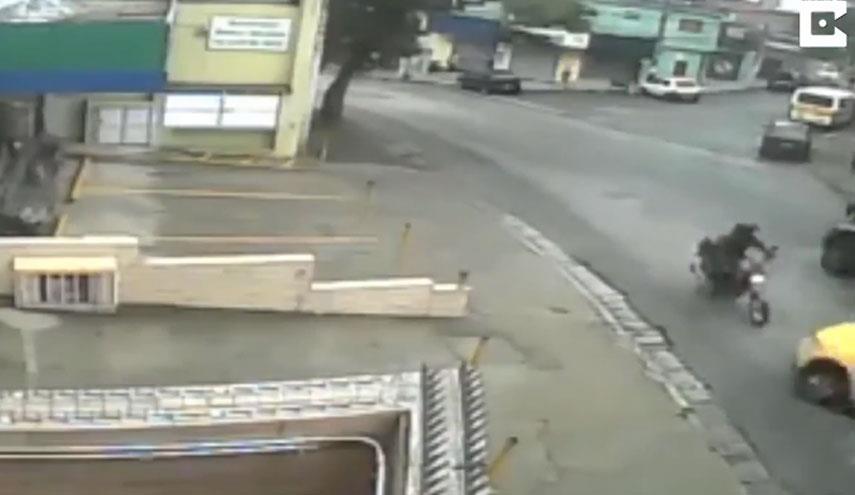 شاهد بالفيديو..سيارة تصدم دراجة نارية والسائق يستقر فوق سقفها