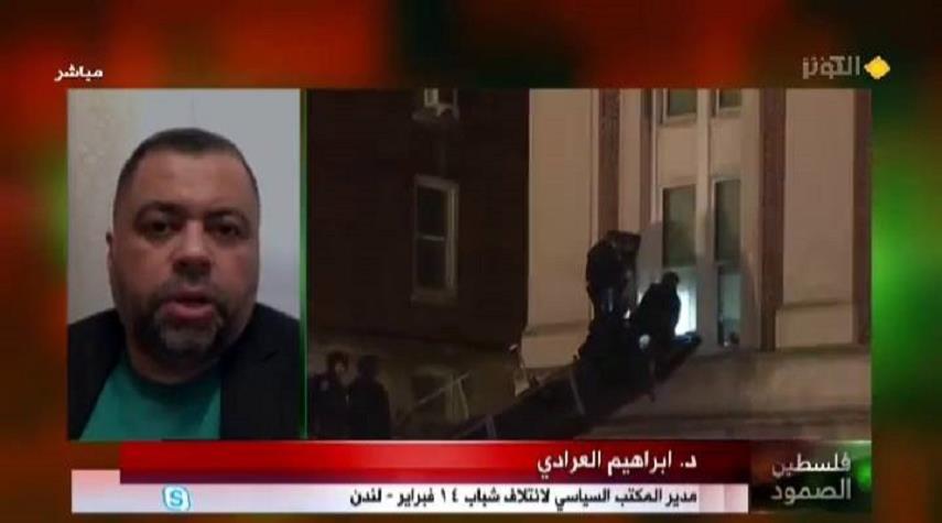 تحدث مدير المكتب السياسي لائتلاف شباب 14 فبراير الدكتور ابراهيم العرادي أمس الأربعاء خلال مشاركته في برنامج فلسطين الصمود عن" ثورة الجامعات.. وخسارة الاحتلال معركة الرأي العام العالمي"