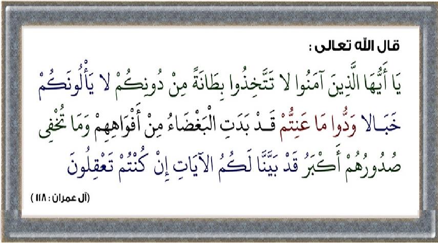 القرآن الكريم-الكوثر: يقول الله عزّ وجلّ في محكم كتابه العزيز: (يَٰٓأَيُّهَا ٱلَّذِينَ ءَامَنُواْ لَا تَتَّخِذُواْ بِطَانَةً مِّن دُونِكُمْ لَا يَأْلُونَكُمْ خَبَالًا وَدُّواْ مَا عَنِتُّمْ قَدْ بَدَتِ ٱلْبَغْضَآءُ مِنْ أَفْوَٰهِهِمْ وَمَا تُخْفِى صُدُورُهُمْ أَكْبَرُ ۚ قَدْ بَيَّنَّا لَكُمُ ٱلْاياتِ ۖ إِن كُنتُمْ تَعْقِلُونَ) "آل عمران: 118" .